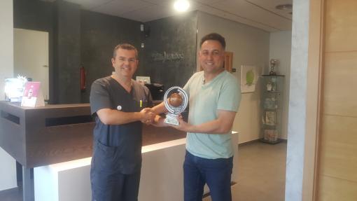 El presidente Jesus Mesonero hace entrega al director del Centre Dental Sr. David por su colaboración un año mas con el C.F. L'Arboç